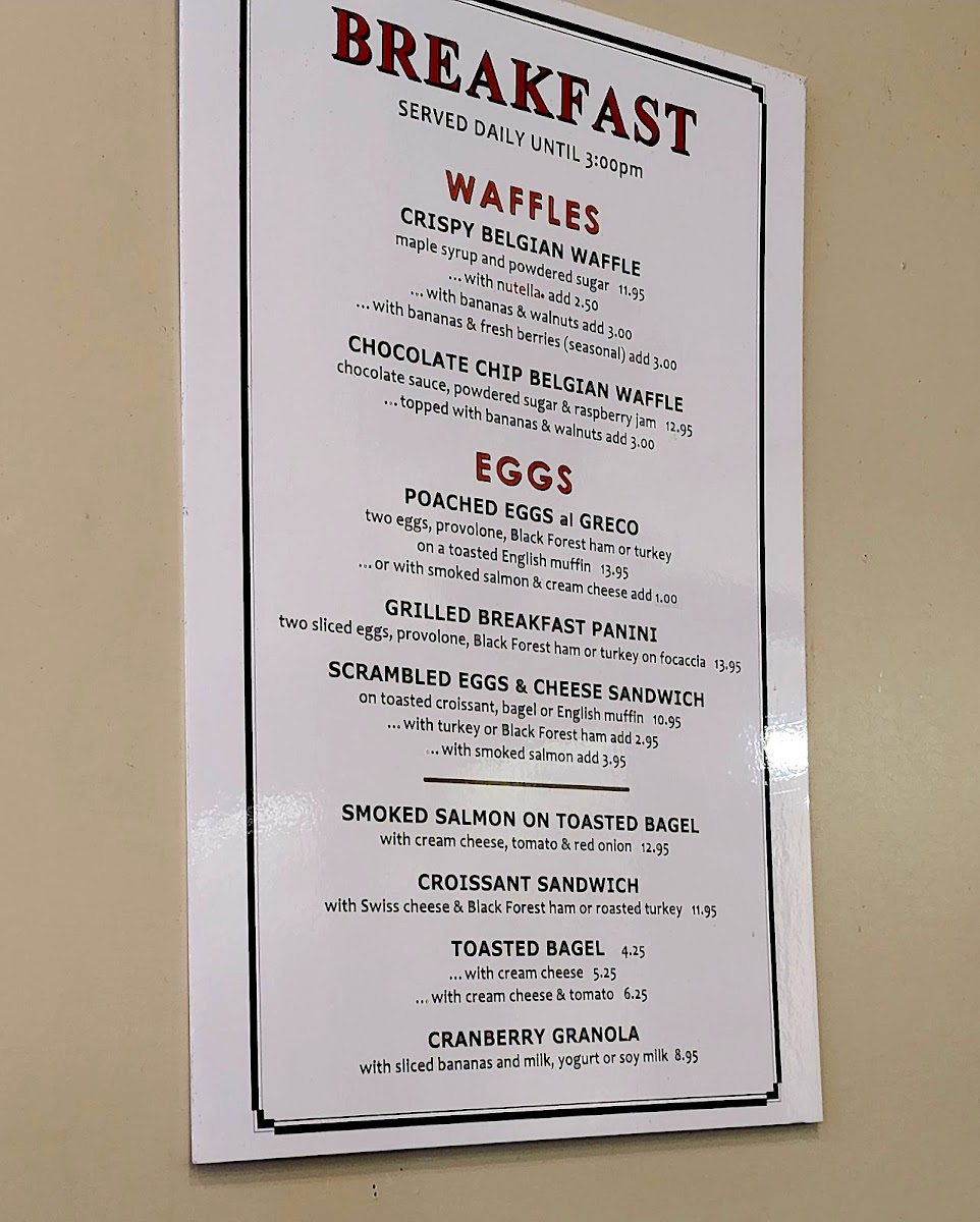 For food, the menu features breakfast options including grilled paninis, poached eggs served with Black Forest ham or smoked salmon, and a Nutella-filled toasted croissant. Several pastries and baked goods are offered, ranging from cookies and biscotti to cakes like lemon cake and tiramisu. The dessert selection includes items such as affogato, cannoli, and Belgian waffles with Nutella.